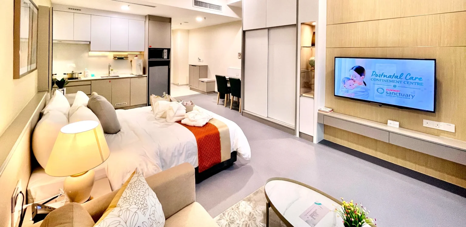The Deluxe Studio offers a calming 422 sq. ft. retreat for new mothers, featuring a queen-sized bed, en suite bathroom, two-seater sofa, and kitchenette for light meal preparation. Enjoy a modern, relaxing space with a stunning city view, designed to support your recovery in comfort.
