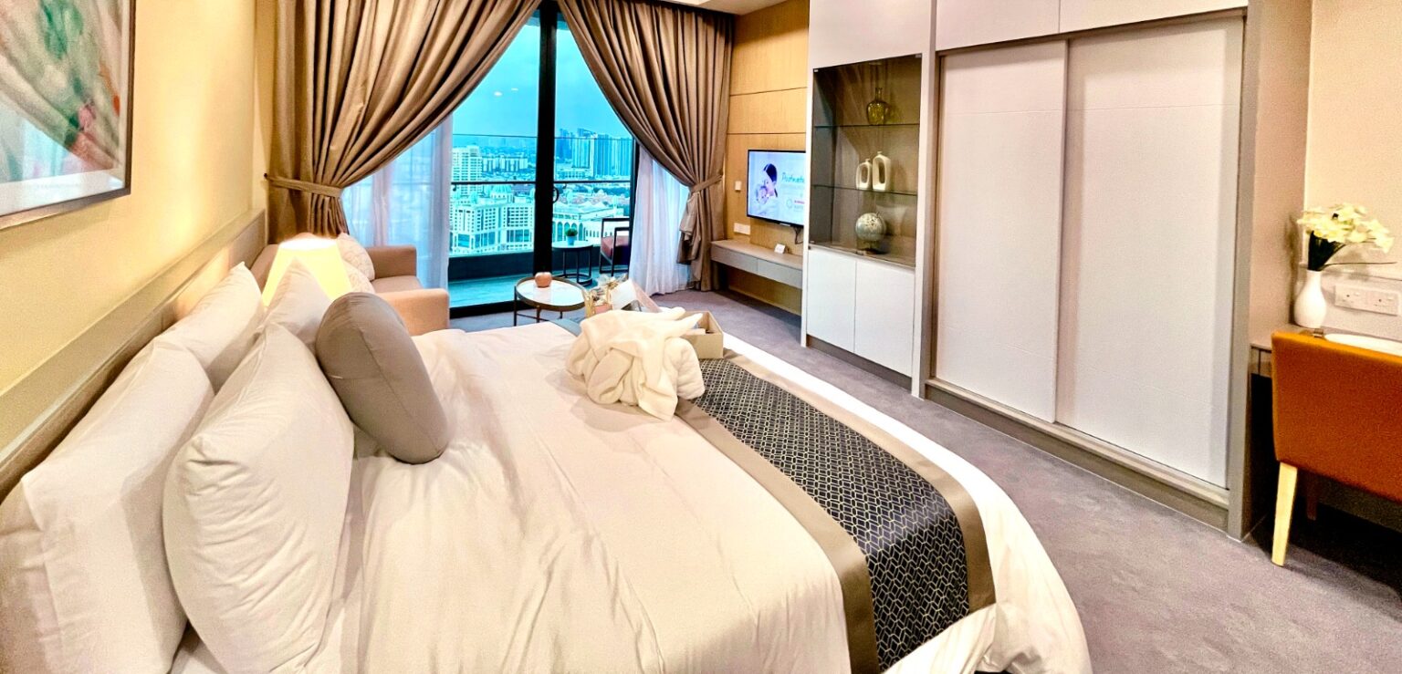The Executive Studio offers a premium 488 sq. ft. postnatal care experience, featuring a king-sized bed, en suite bathroom, cosy seating area, and kitchenette. Overlooking Sunway Lagoon and the city skyline, it provides a modern, soothing space for new mothers to relax and recover in comfort.